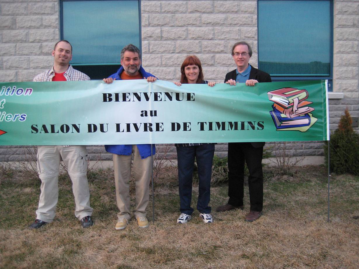 Les 4 invités (André Paul à gauche) derrière la bannière du Salon du livre de Timmins.