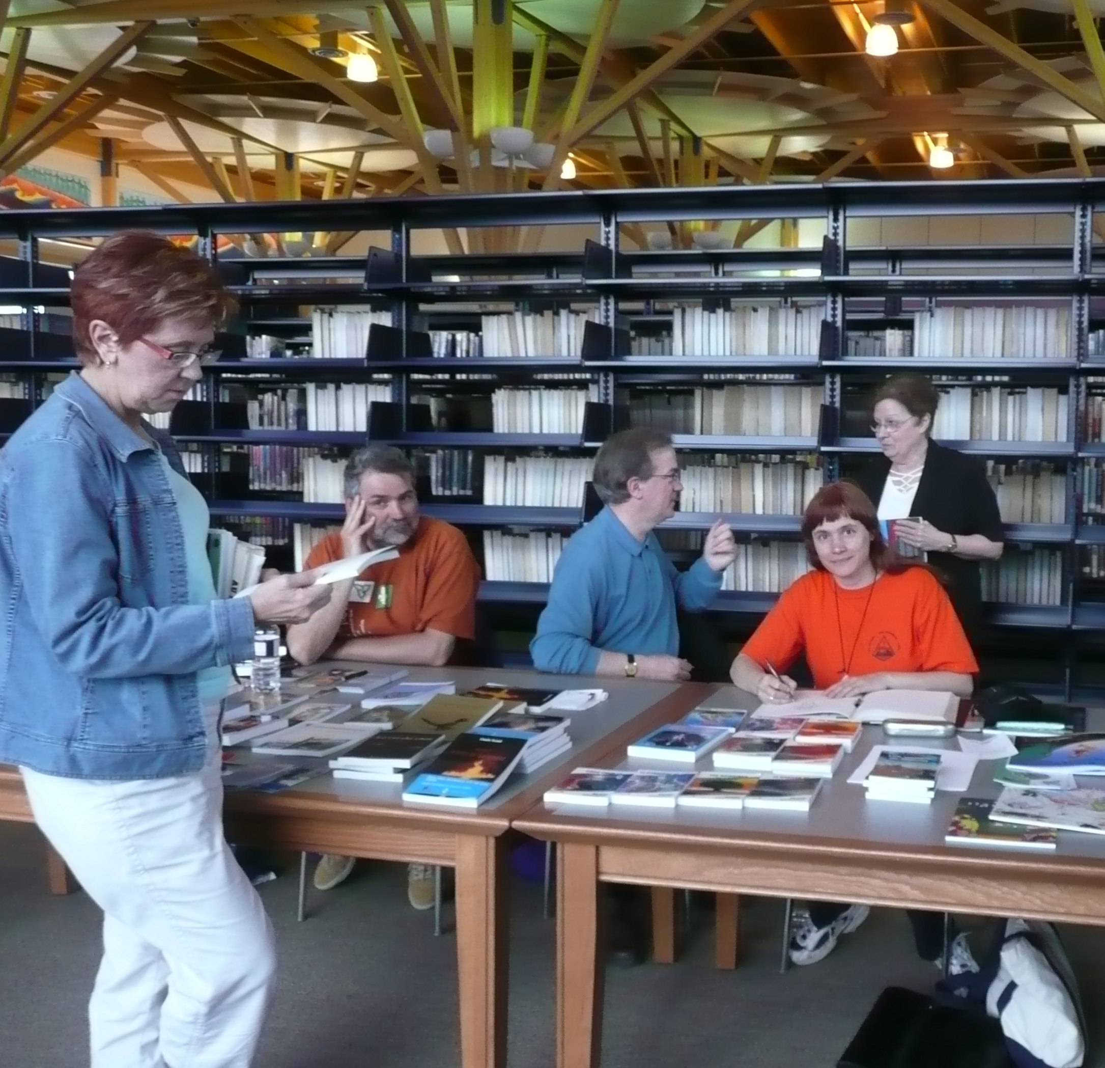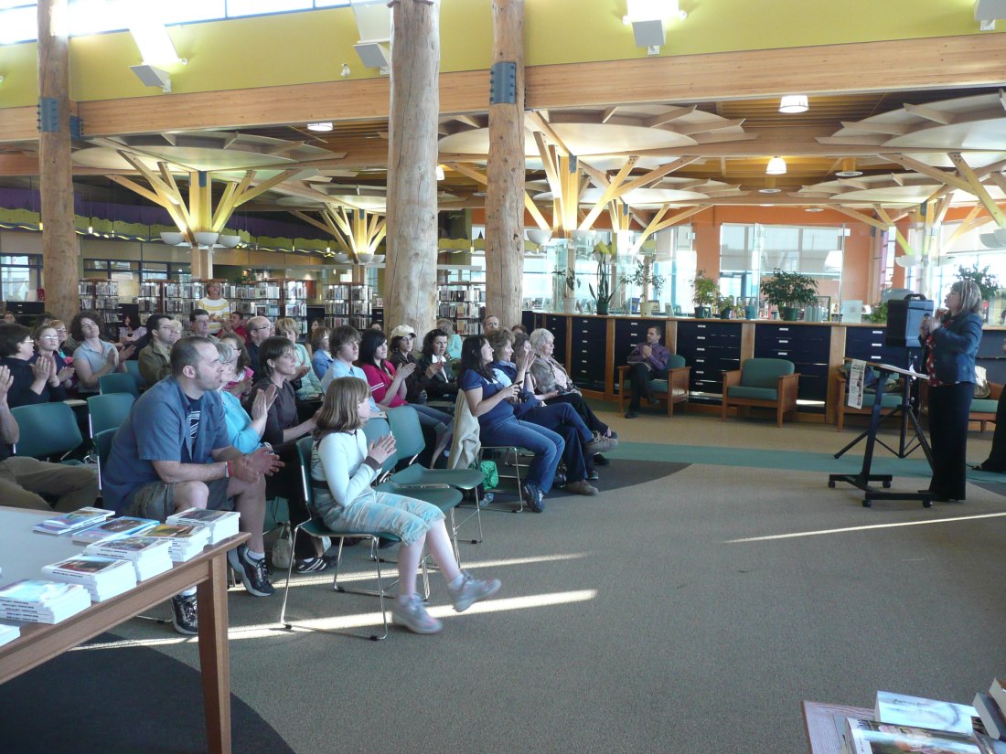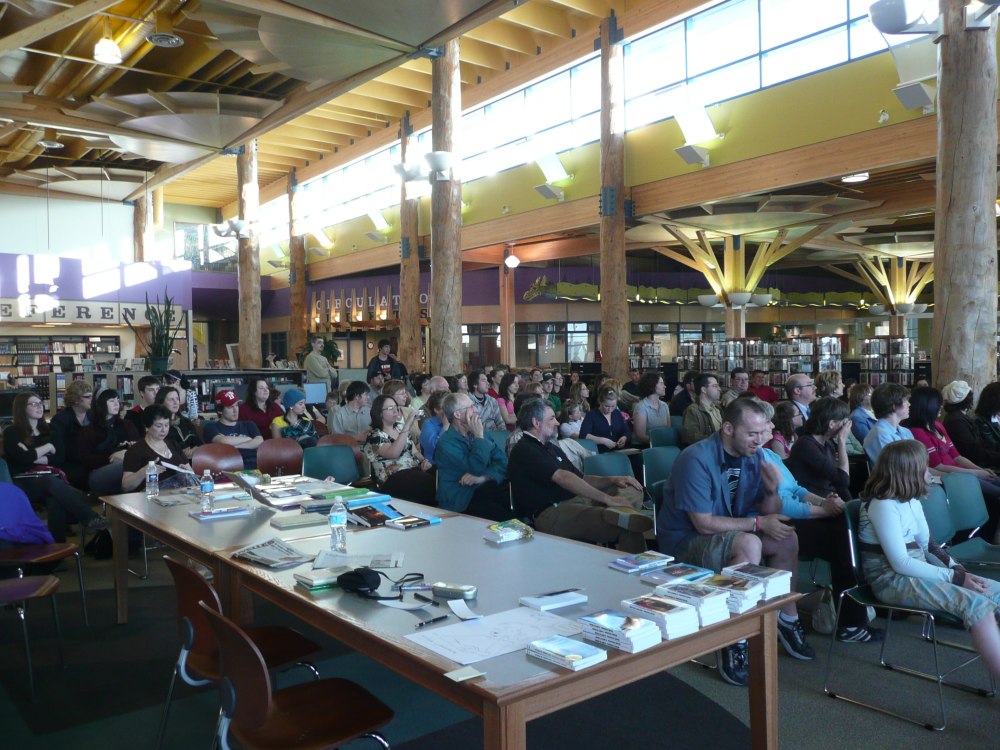 Le Salon s’est tenu dans la superbe bibliothèque municipales de Timmins, aux hautes colonnes d’épinette et aux poutres arborescentes, les grandes vitres laissant entrer le soleil, et des canots, dragons suspendus sous le plafond.