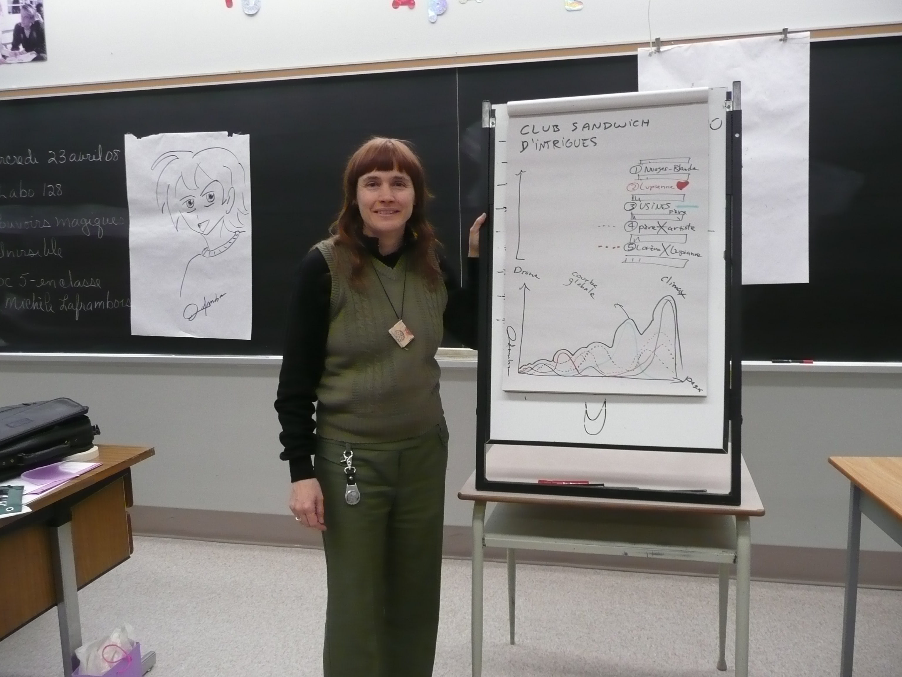 Atelier à l’école secondaire Msgr Thériault. J’explique le club-sandwich d’intrigues. Ça donne faim.