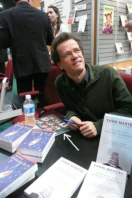 Yann Martel, à qui j’ai prêté ma BD « séances de signatures » le temps d’aller à la caisse acheter son livre « Mais que lit donc Stephen Harper? »