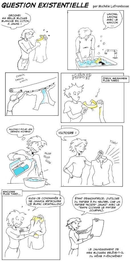 Soit l’acidité ambiante de notre sueur salée contamine nos blouse. Un petit coup de Javex et hop! le problème se règle… pour peu de temps. (Et du point de vue écologique, le javellisant chloré n’aide pas). Hélas, très vite, le jaune revient.