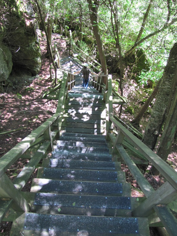 Un escalier de bois donne accès à une grotte creusée dans la roche poreuse. Il s’agit de la dolomie silurienne formant les falaises blanches de l’escarpement du Niagara si,si! Comme le calcaire, la dolomie est poreuse et se dissout à la longue avec le ruisellement.