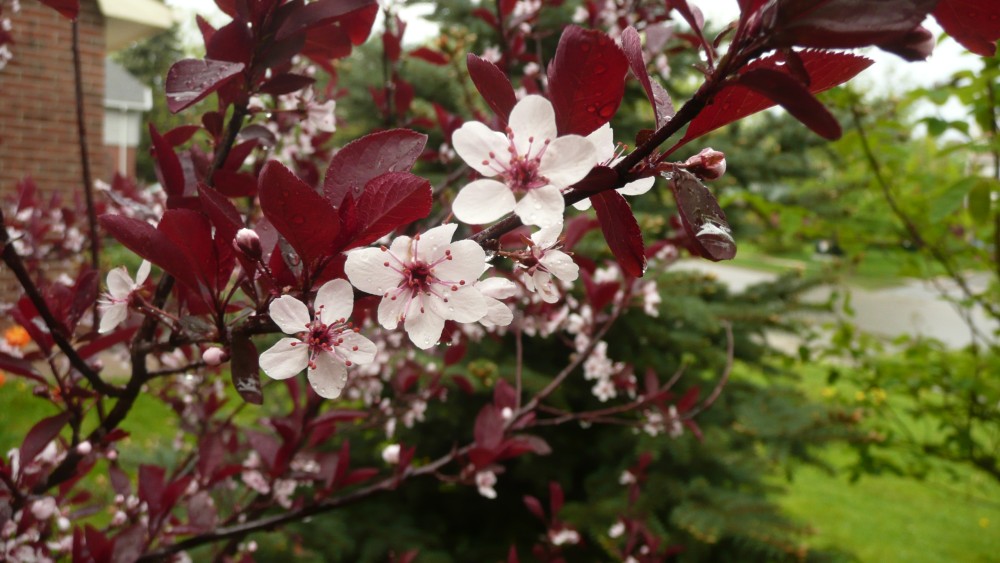 Les pâles boutons du Prunus exotique parmi le feuillage rouge vin.