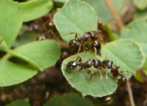Je n’ai pas encore identifié l’espèce (autour de 6 mm de long, région de Toronto). Mon Audubon Society field guide to North american insects and spiders ne recense que huit ou neuf espèces. Fourmi charpentière? Lutte fratricide ou simple communication olfactive?