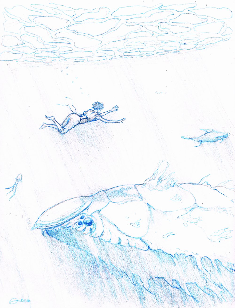 En attendant ma prochaine BD, voici un dessin silencieux d’une rencontre sous-marine, réalisé au crayon de couleur. Dessiner un monstre aquatique a été un défi. Le plaisir a été d’orienter les rayons de lumières qui tombent sur les masses. Le rendu est pâle, mais j’ai augmenté l’intensité de la couleur après le scan du dessin.