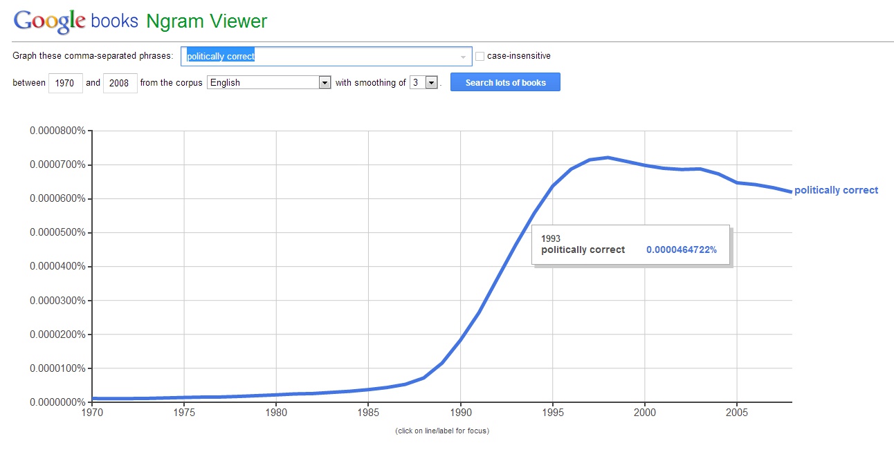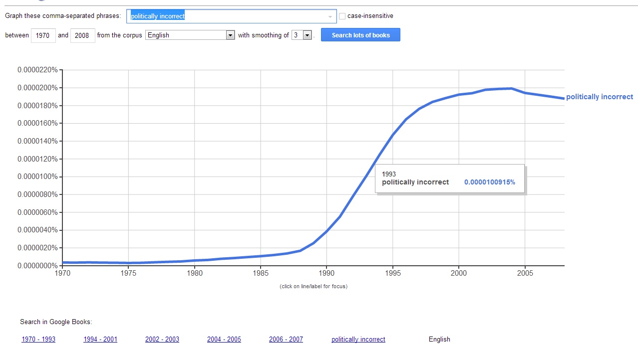 Voir ici le graphe d’usage des mots politically correct compilé sur le site Ngram. Celui du P-incorrect suit plus bas.