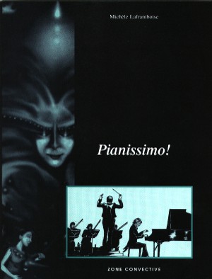 Vous remarquerez le bel album Pianissimo que je me suis amusée à glisser dans la page. Pianissimo, lancé en 1997, reste mon album le plus travaillé à une époque où je cherchais encore ma voie (et voix!) artistique. Karine vole par magie le talent d’un pianiste, le timide Léonid, dont la vie bascule. S’ensuit une suite de quiproquos alors que Karine tente de réparer son acte. Publié par Zone convective, racheté et distribué par Les 400 Coups, l’album jugé pas assez commercial a été élagué par cet éditeur. Je possède encore quelques exemplaires.
