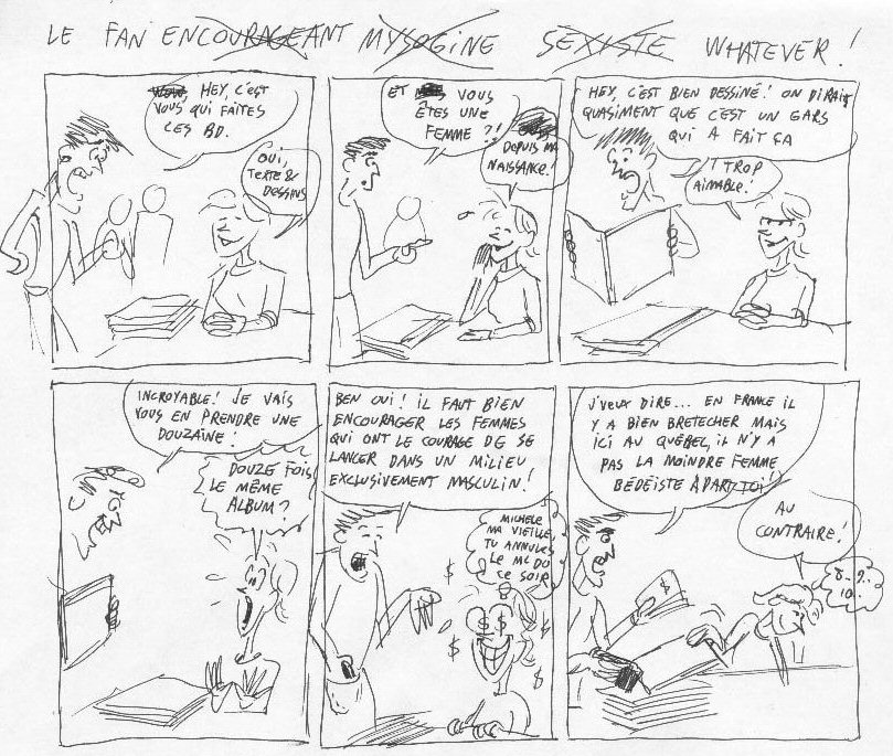 Pour revenir à du positif, félicitations à mes confrères de BD qui s’assument sans tambour ni trompette, et sans essayer d’enfermer des gens dans de petites boîtes « essentialistes ». Pour résumer, l’essentialisme c’est de restreindre les rêves et les aspirations des gens à leur essence (pas la gasoline, mais leur « nature » masculine ou féminine) sans considérer que ces différences ont pu être construites socialement.