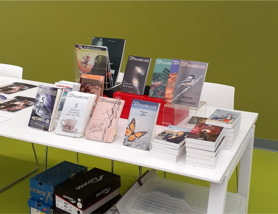 En se déplaçant, le Salon comptait moins d’exposants, mais ma compagnie Échofictions y était, offrant pas moins de 40 titres, mes romans publiés sauf ceux chez David, mes livres courts chez Échofictions, mes BD… Aussi, un plus petit salon