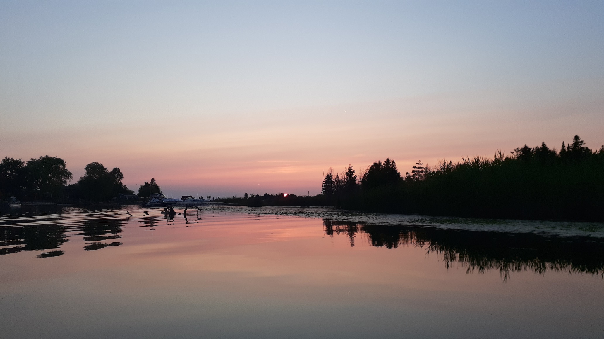 Coucher de soleil capturé depuis mon kayak sur la rivière, avec un petit clin d’œil du soleil qui se retire pour la nuit. Et la savante folle va en faire autant….