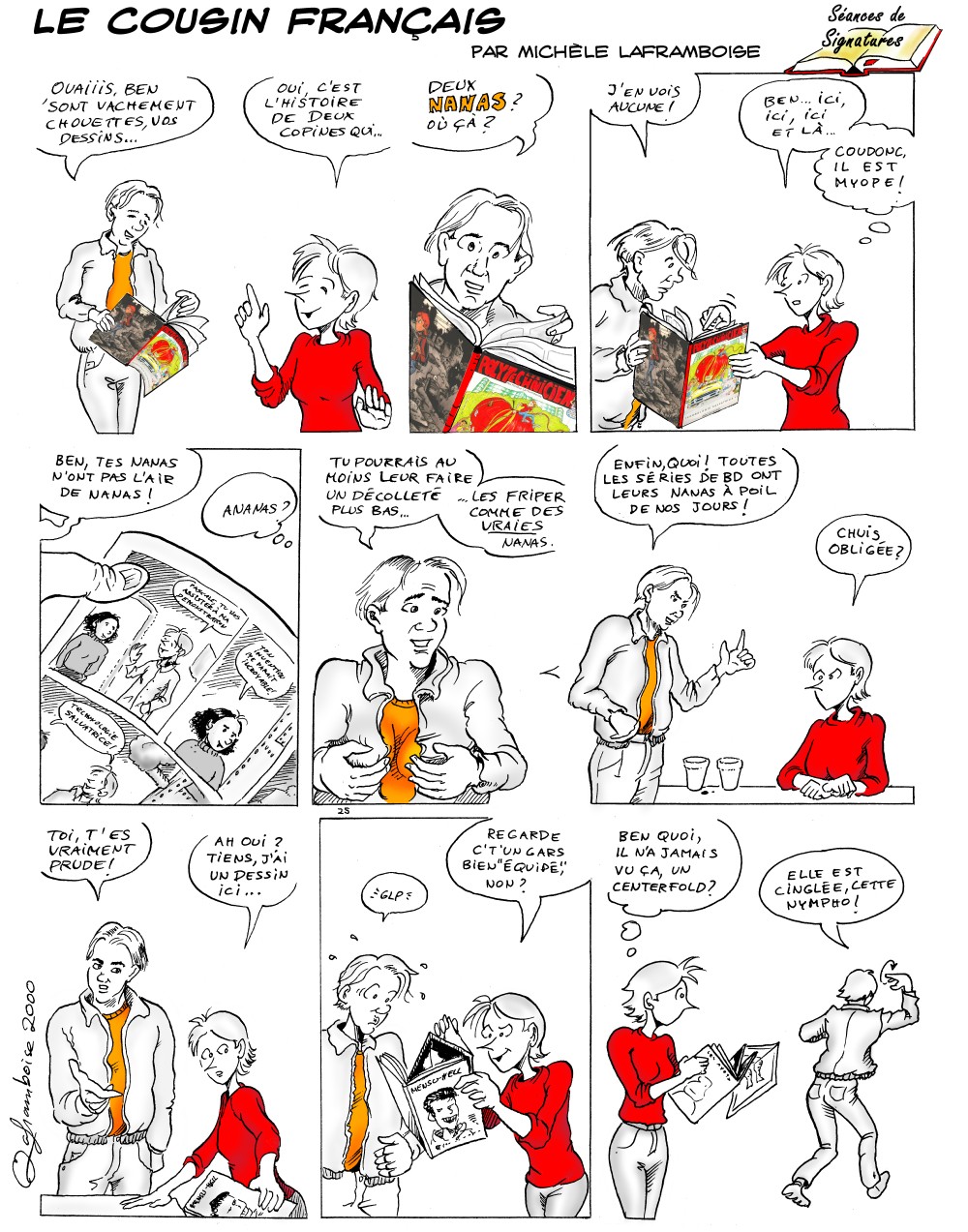 Par contre, un fan qui se dénigre trop finit par tomber sur les nerfs, comme dans ce gag. Y a rien de pire pour un auteur non-vedette qu’un fan qui fait fuir le public… Inspiré par plusieurs rencontres, les trois premières répliques du fan sont des citations verbatim; heureusement, aucun fan n’est allé aussi loin! Il y a dans ce dénigrement une recherche d’approbation cachée, ce qu’on a tous plus ou moins vécu à nos débuts. (Notez la façon dont il tient la BD, très mauvais pour la reliure!!)