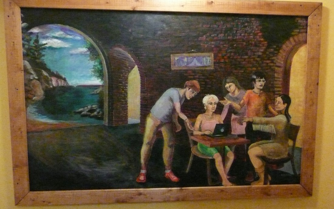 Pendant le Salon du livre, j’ai logé dans une auberge jeunesse de Toronto. En descendant l’escalier pour aller déjeuner, j’ai noté ce cadre qui illustre très bien l’esprit des auberges, avec des fantômes des voyageurs du passé qui regardent ceux du présent.