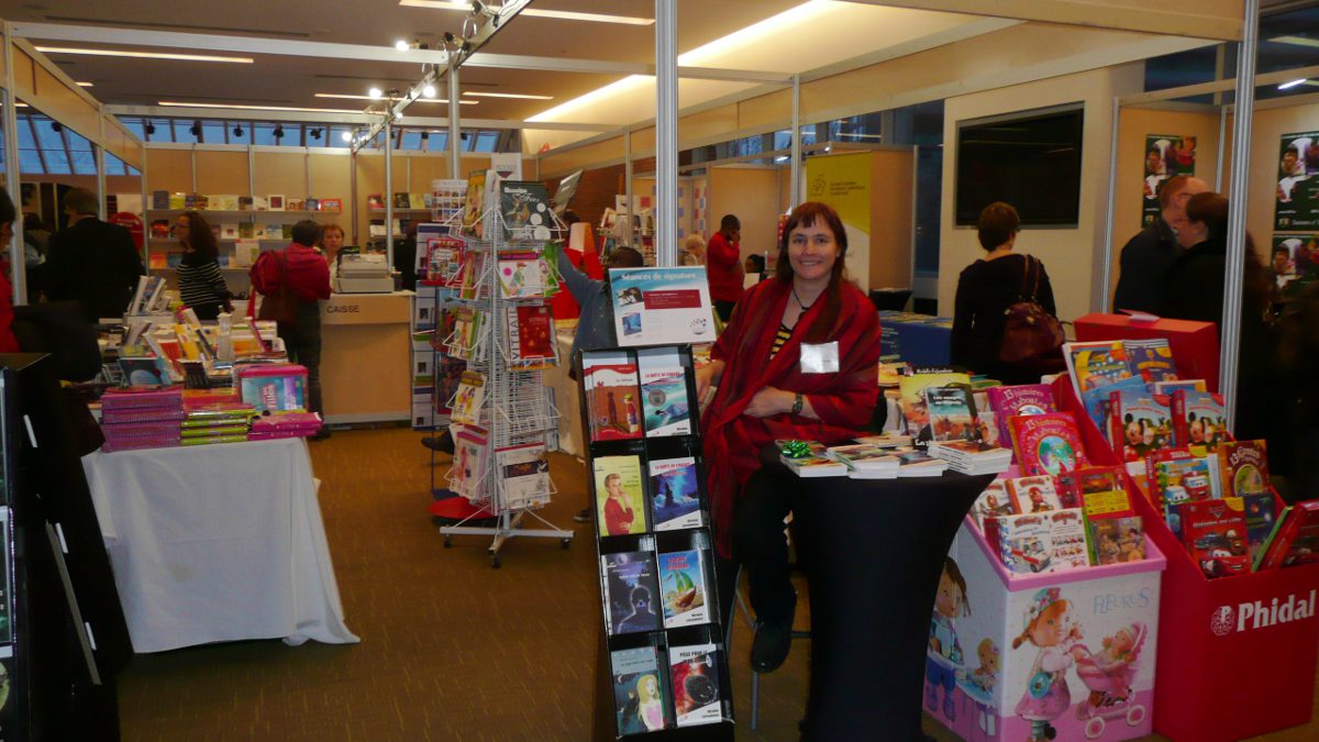 Ma table était bien placée, près de l’entrée du Salon, mais son seul défaut : elle était un peu petite pour y faire tenir tous les livres… et c’est facile de tomber. Le dangers de la vie d’auteure… Voici une photo prise entre deux assauts par mes hordes de fans féroces! Notez le beau présentoir qui met les oeuvres en valeur.