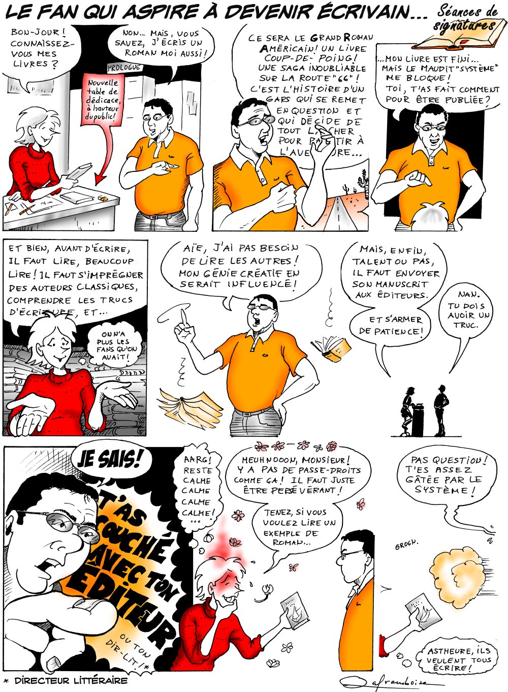 Cette page de BD  a été reprise et reformatée à partir de ma série « Séances de signatures« , qui eut un bon succès au point qu’il ne reste plus d’album en circulation. Depuis, l’éditeur a cessé ses activités tandis que je poursuis les miennes.